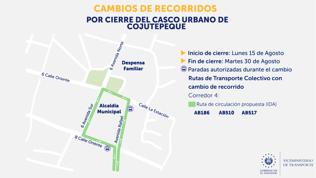 Inicio > Noticias > CAMBIOS TEMPORALES DE RECORRIDOS Y PARADAS DE BUSES POR FIESTAS PATRONALES DEL MUNICIPIO DE COJUTEPEQUE